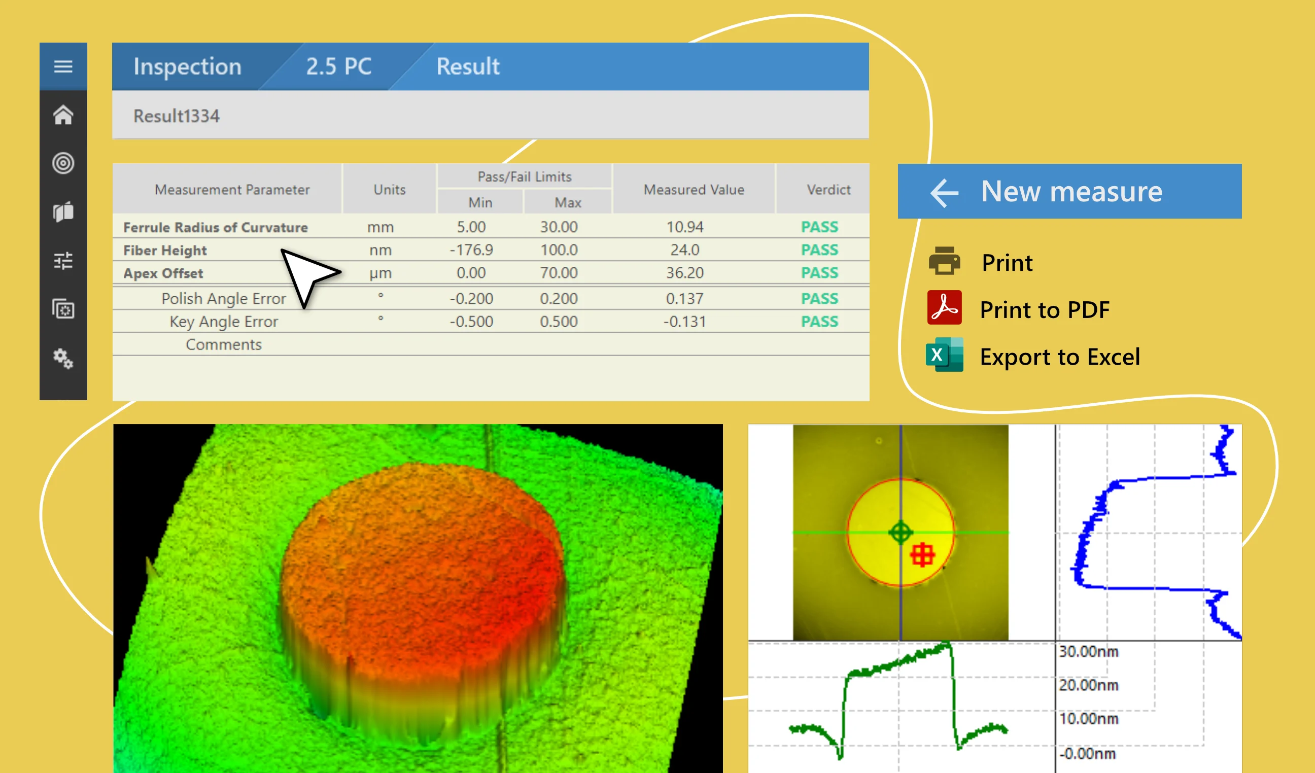Full Report contains measured geometry parameters. Print or export the report to certify your connector.